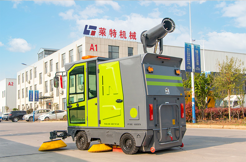 莱特LT-G50型全封闭四轮驾驶式扫地车,配备高压清洗和高压雾炮功能,清扫宽度2500mm,满电工作时间为6-8小时,工作效率25000㎡/h,采用的是8*200A免维护铅酸电池,高压雾炮射程可达10米以上,可对作业环境高效的降尘,还可以用于绿植养护和环境消杀。高压水枪可以对地面顽固污渍进行清洁,还可以冲洗路牙石,为绿植浇水,工作之余,还可以用高压水枪清洗车辆。应用场景为:厂区、车间、公园、街道、物业小区、码头、学校、机场、停车场、地下车库、充电站、加油站、公园工厂、工业园区等需要大面积清扫的区域区域。