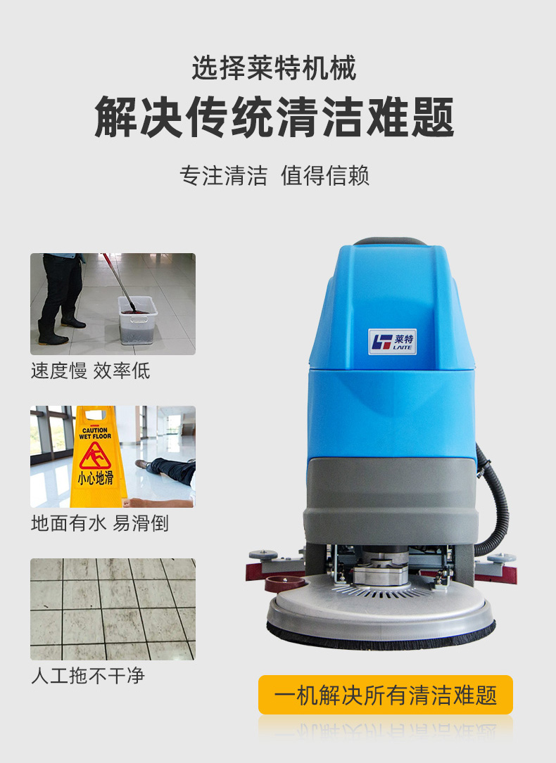 莱特LT-M2型手推式工业洗地机,工作效率2300㎡/h,清洗宽度530mm,吸水宽度800mm,电池容量24V/100Ah,采用大功率品牌电机,广泛用于工厂、车间、医院、商场、机场、地下车库等场景,洗刷吸三合一,去污不留痕,充满电可以连续工作2-3小时,适用于6000㎡左右的工作场地。